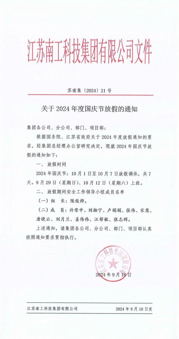 您的位置:集团首页 >> 新闻中心 >> 集团公告 >> 关于2024年度国庆节放假的通知