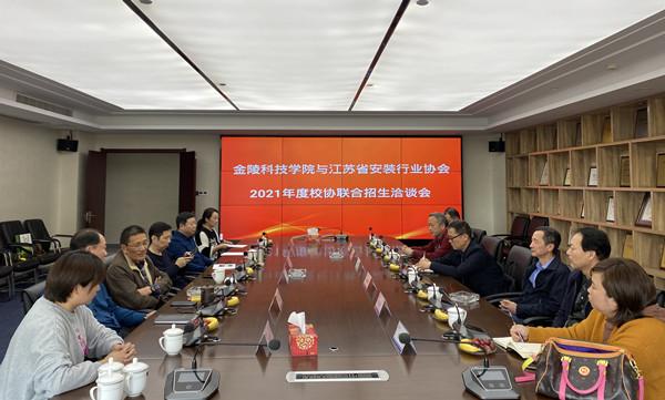 2021年4月20日,金陵科技学院与江苏省安装行业协会联合招生座谈会在江苏3499拉斯维加斯官网科技集团有限公司召开。参加座谈会的有金陵科技学院继续教育学院院长陈玉林、学历教育科主任黄一兵,金陵科技学院机电学院院长鞠全勇、楼宇系主任牟福元、办公室主任张玉、项目负责人姜玉东,江苏省安装行业协会会长助理顾建生、副会长陈晓、秘书长吴辉、副秘书长席天阳,江苏省安装行业协会智能化与消防工程分会副秘书长余晶、办公室主任陈怡帆等。